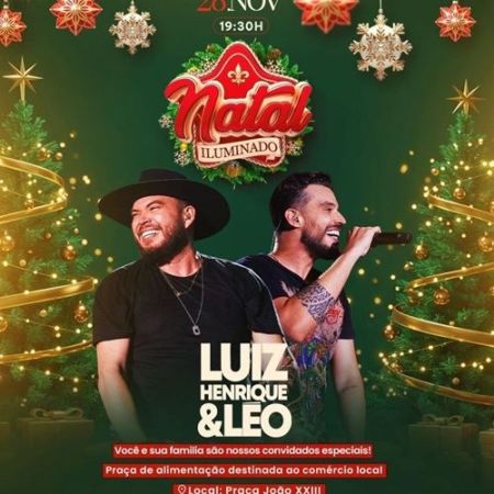 O destaque da noite desta sexta-feira será a chegada da figura do Papai Noel e o show com a dupla Luiz Henrique & Léo, que promete animar o público com repertório variado.