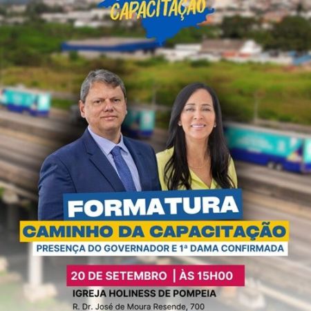 19/09/2025 - Amanhã, sábado, 20 de setembro, às 15h, Pompéia será palco de um evento histórico: a formatura dos participantes dos cursos do projeto Caminho da Capacitação, realizado pelo Fundo Social de São Paulo. A cerimônia acontecerá na quadra da Igreja Holiness de Pompéia (Rua José de Moura Resende, 700 – próximo da prefeitura) e contará com a presença do governador do Estado de São Paulo, Tarcísio de Freitas, e da primeira-dama do Estado, Cristiane Freitas.